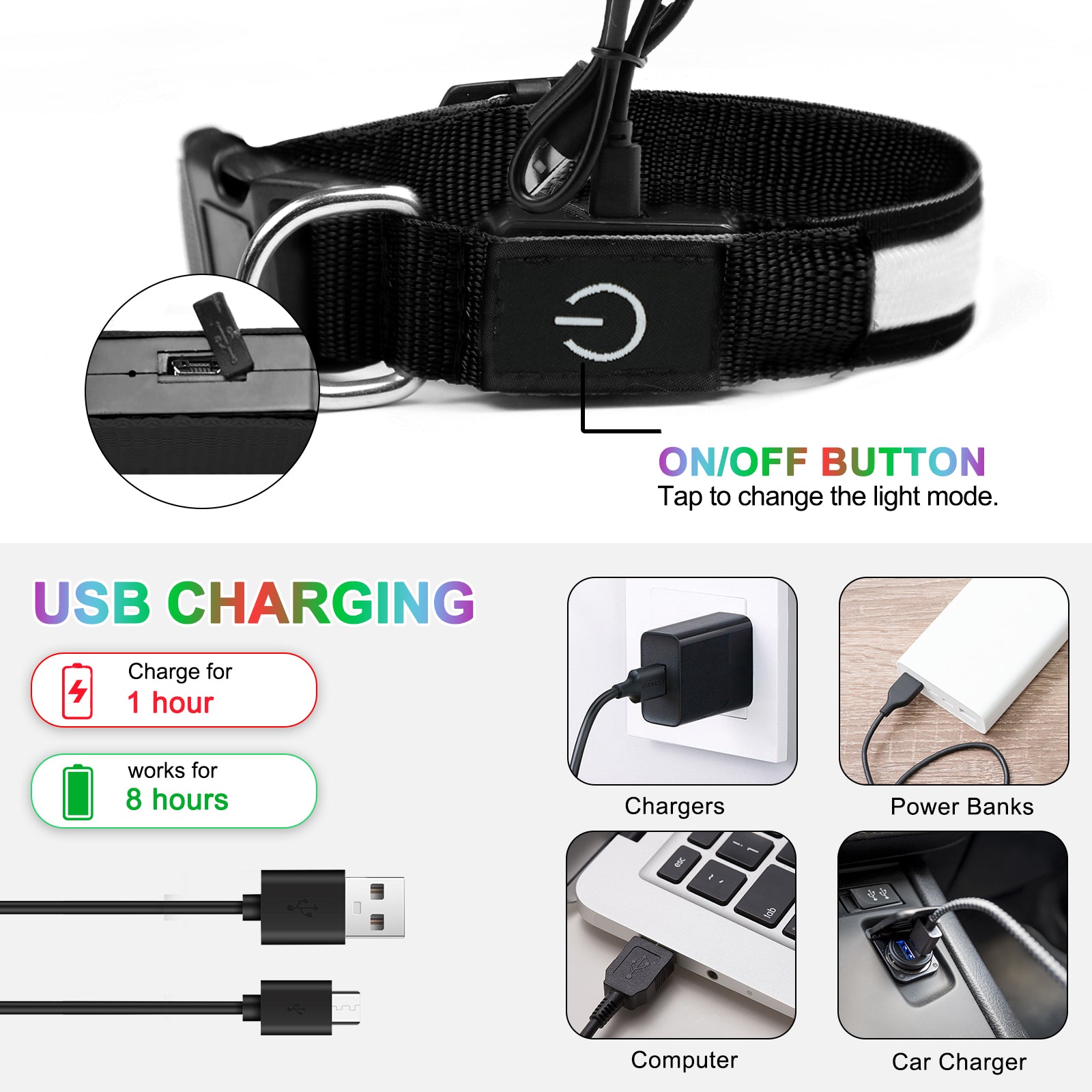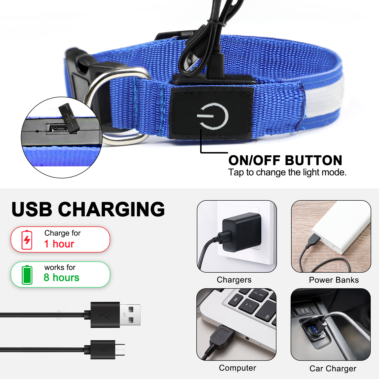 - LED DOG COLLAR RECHARGEABLE BY USB : The LED dog collar only needs to be charged for 1 hour to keep the light on for 7-8 hours, keep your dog safe on the go all the time. Using the included charging cable, which can be recharged by charger, mobile power or computer. This light-up dog collar is powered by rechargeable batteries that don't need to be replaced, saving you time and money.Tips:Please seal the charging port after charging.